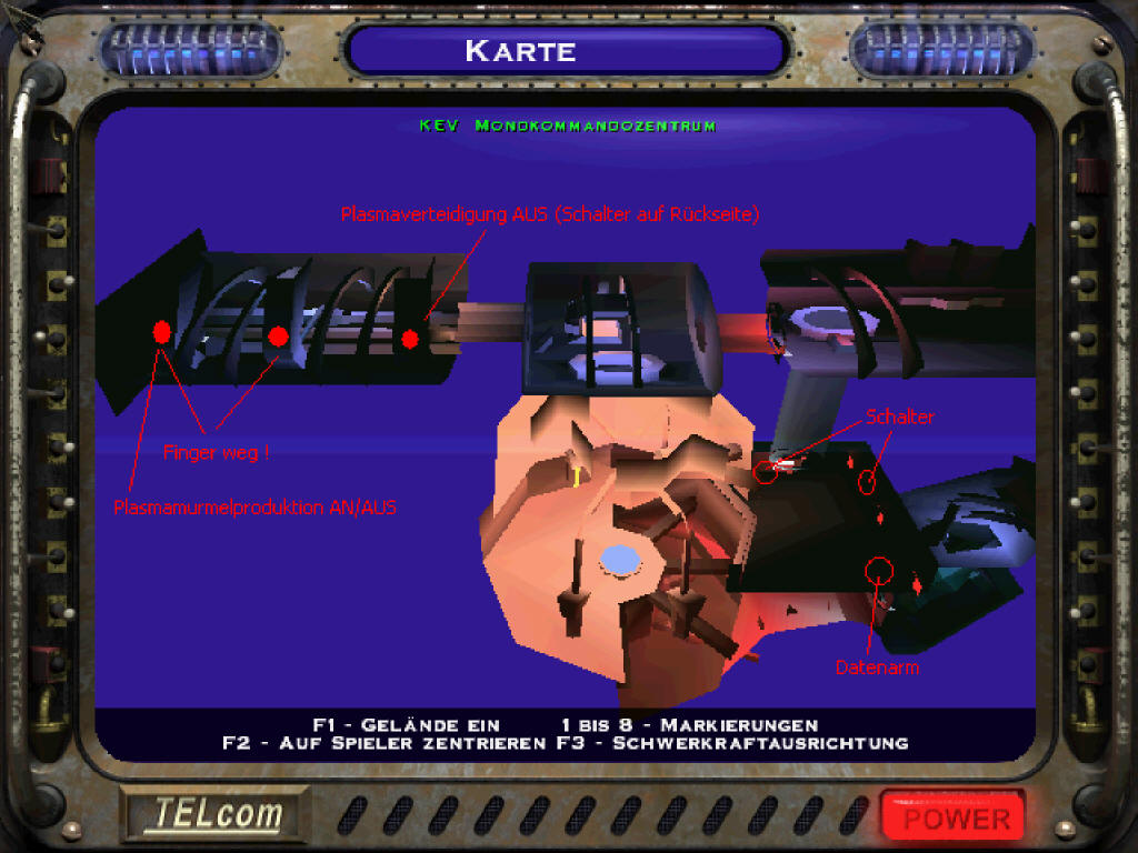Sind diese Schalter nun alle aktiviert, dann flieg in den großen Raum zurück und gleich steil nach unten. An dem unterm Sockel der Datenübertragungsplattform (was für ein Wort) ist soweit ich mich erinnere ebenfalls ein Schalter, der aktiviert werden muss.