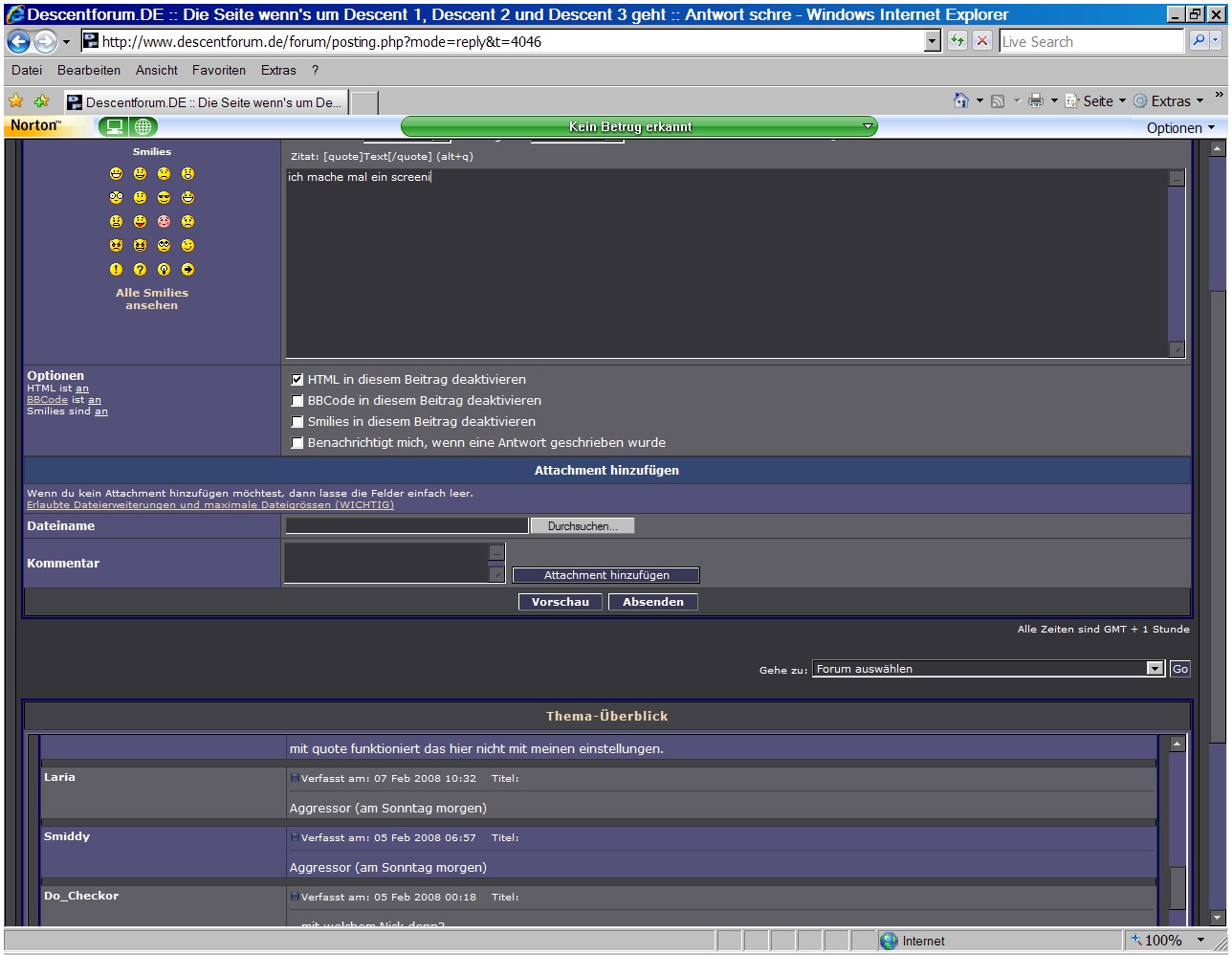 Dennoch: Das bei Dir das "Quote" System nicht funktioniert ist mit Sicherheit ein Browser oder Norton Problem. Empfehle so oder so: Firefox oder noch besser: www.opera.com . Wie "toll" und "sicher" der Internet Explorer ist *schüttel* sollte langsam wirklich allgemein bekannt sein.